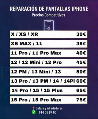 📱 ¡Pantalla de iPhone Rota! No te Preocupes, ¡Tenemos la Solución! 🛠️ ¿Tu pantalla de iPhone se ha llevado un golpe? En lugar de gastar una fortuna, puedes reparar la pantalla con nosotros de forma rápida, profesional y al mejor precio. 🚀 Servicio de Reparación de Pantallas Precios sin competencia y reparación realizada en 1 hora Reparamos tu iPhone en Getafe y Alrededores. ¡Opción a domicilio disponible! Arreglamos tu móvil donde tú estés para tu mayor comodidad. Si tu batería dura poco y necesitas cambiarla por poco dinero mas se cambiaria a la vez que tu pantalla. WhatsApp: 615 05 97 60