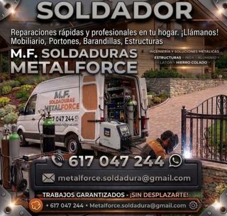 🛠️ SOLDADURA PROFESIONAL 🛠️ También con servicio URGENCIAS 24h Reparación y fabricación en todo tipo de metales. ¡Soluciones rápidas y duraderas! ✅ MATERIALES: Aluminio, Inox, Hierro, Latón, Cobre y Acero Colado. 📍 REPARACIONES COMUNES: • Llantas, cárters, bloques motor , estructuras, chasis óxidos corrosión vallados valla puertas escapes. • Cuadros de bici, náutica chalets , tractores aperos hostelería • Puertas, rejas, sillas y maquinaria. 💰 PIDE TU PRESUPUESTO: Pásame una foto de la avería por aquí. 📲 WhatsApp: 617 047 244 📩metalforce.soldadura@gmail.com