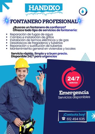 ¿Buscas un fontanero de confianza? Ofrezco todo tipo de servicios de fontanería: Reparación de fugas de agua Cambio e instalación de grifos Instalación de termos eléctricos y de gas Desatascos de fregaderos y tuberías Reparación y sustitución de tuberías Mantenimiento general en viviendas y locales Servicio rápido, limpio y a buen precio. Disponible 24/7 para urgencias. LLAMAR O ESCRIBIR EN EL WHATSAPP