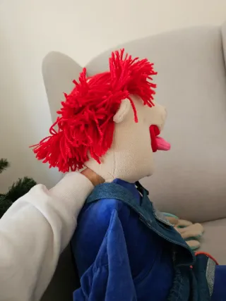 Terry es un muñeco para ayudar a hacer praxias bucofaciales a niños. Puedes interactuar con él metiendo tus manos por sus brazos y cara. Ayuda a mover la lengua, la cara...Es del tamaño de un niño. Está como nuevo y tiene ropita tanto de niña (vestido) como de niño (chaleco y pantalón)
