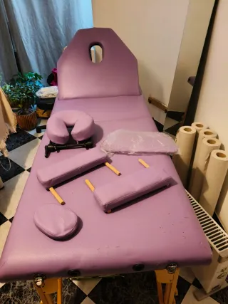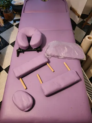 Camilla de masaje sin apenas uso y todos los accesorios sin estrenar, tiene rasguños de mi gata que se quedó en la habitación y la arañó pero con un papel o sábana no se ve. 186*66 cm