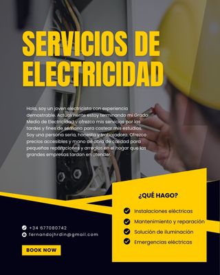 Hola, soy Fernando. Electricista con experiencia y actualmente terminando mi Grado Medio de Electricidad. Busco trabajos para costear mis estudios y ayudar a mi familia. Soy rápido, serio, responsable y ofrezco precios mucho más accesibles que las grandes empresas. Mi disponibilidad: L, X, J, V: Desde las 14:00h Martes: Desde las 12:00h Fines de Semana: Disponible Servicios Principales: Instalación y reparación de Lámparas, focos, LED. Cambio de enchufes e interruptores. Solución de averías y cortocircuitos. Montaje de ventiladores. Mantenimiento general. Cuento con mis propias herramientas. Pide presupuesto sin compromis