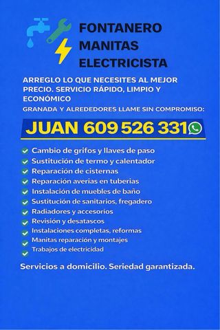 🚰 Fontanero 🛠️ Manitas del hogar⚡️Electricista Arreglo lo que necesites al mejor precio. Servicio rápido, limpio y económico Granada y alrededores llame sin compromiso: Juan 609 52 63 31 POR WASAP MEJOR ✅ Cambio de grifos y llaves de paso ✅ Sustitución de termo y calentador ✅ Reparación de cisternas ✅ Instalación de muebles de baño ✅ Sustitución de sanitarios, fregadero ✅ Radiadores y accesorios ✅ Revisión y desatascos ✅ Instalaciones completas, reformas ✅ Manitas reparación y montajes ✅ Trabajos básicos de electricidad Trabajo rápido y de confianza, con precios ajustados y trato cercano. 📍 Servicios a domicilio seriedad