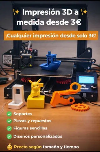 🎨 Colores disponibles: blanco, rosa, azul y rojo 🚀 ¿Necesitas una impresión 3D? ¡Te la hacemos! Imprimimos pequeños objetos en 3D de forma rápida y económica. ✅ Soportes ✅ Piezas y repuestos ✅ Figuras sencillas ✅ Diseños personalizados 💰 Precio desde solo 3€ (depende del tamaño y del tiempo de impresión) 📐 Puedes traer tu diseño o contarnos la idea 📦 Envío solo por Correos o entrega en mano 📩 Contacto únicamente por mensajes de Wallapop Pregunta sin compromiso 😄 💣Video mas detallado en tiktok cuenta (tienda.online.wallpop.es)
