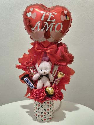 Arreglo taza + rosas eternas, mini chocolates, mini peluche y globos