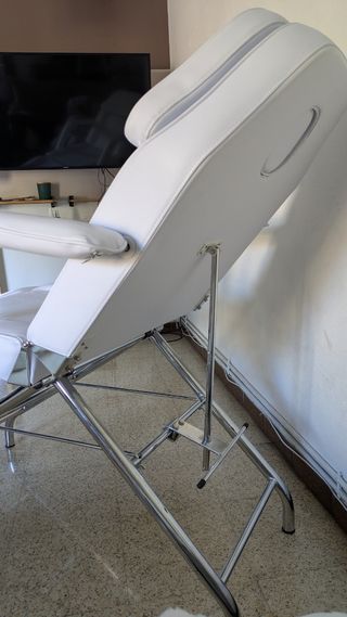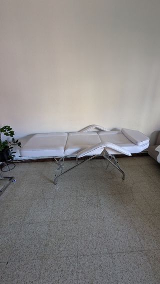 Cama de masaje plegable en color blanco, ideal para tratamientos estéticos o fisioterapia. Se encuentra en buen estado. se ha marcado el color de la funda en la superficie. ver fotos - Estructura de aluminio. - Tapizado blanco. - Mecanismo de plegado fácil. - regula podiciones de altuta. - regula posiciones de la espalda.