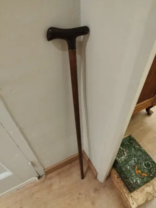 Bastón clásico con un diseño elegante y funcional. Su empuñadura en forma de T proporciona un agarre cómodo. - Material del palo: Madera. - Material de la empuñadura: Madera oscura.