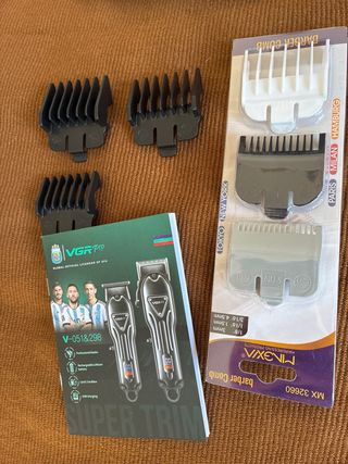 Maquinas con 2 usos pero limpiadas a fondo. Cables nuevos sin uso. Pack de peines guias de 0.5/1/1,5. La caja rayada debido a abrir el envase cuando lo recibí.