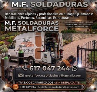 🛠️ SOLDADURA PROFESIONAL 🛠️ También con servicio URGENCIAS 24h Reparación y fabricación en todo tipo de metales. ¡Soluciones rápidas y duraderas! ✅ MATERIALES: Aluminio, Inox, Hierro, Latón, Cobre y Acero Colado. 📍 REPARACIONES COMUNES: • Llantas, cárters, bloques motor , estructuras, chasis óxidos corrosión vallados valla puertas escapes. • Cuadros de bici, náutica chalets , tractores aperos hostelería • Puertas, rejas, sillas y maquinaria. 💰 PIDE TU PRESUPUESTO: Pásame una foto de la avería por aquí. 📲 WhatsApp: 617 047 244 📩metalforce.soldadura@gmail.com