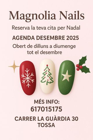 Agenda abierta diciembre Abierto de lunes a domingo 10:00/18:00 Magnolia nails salo d'ungles Carrer la guardia 30 tossa de mar Más info 617015175 o en el mismo salón Pinta tus uñas desde 10€ Gel desde 30€