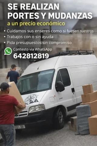 Ofrezco servicios de mudanzas y portes en toda España. Contamos con un equipo profesional y vehículos adecuados para garantizar un traslado seguro y eficiente de tus pertenencias. - Traslados a cualquier punto de España. - Servicio de montaje y desmontaje de muebles. - Mudanzas de habitación. - Vaciado de pisos. - Servicio al punto limpio. - Recogida de encargos y muebles. - Transporte al aeropuerto.644052791