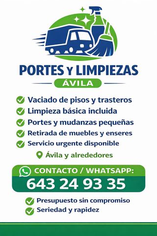 Realizamos portes, mudanzas pequeñas y vaciados de pisos, trasteros y locales en toda Ávila y cercanias. Nos encargamos de: – Portes y transporte de muebles – Vaciado de pisos y trasteros – Retirada de muebles y enseres – Limpieza básica incluida tras el vaciado Servicio rápido, serio y sin complicaciones. Presupuesto cerrado y sin compromiso por WhatsApp. Disponibilidad inmediata.