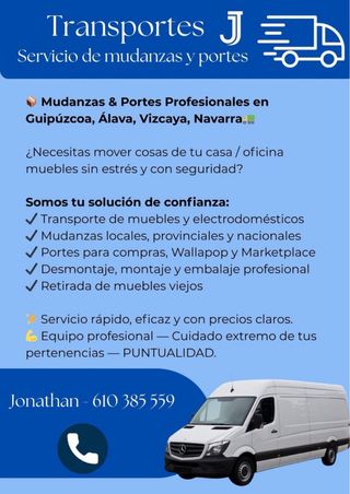 Ofrezco servicios de mudanzas y transportes con 2 años de experiencia en el sector. Contamos con 2 vehículos propios, ideales para transportar todo tipo de objetos de forma segura y rápida. 🔸 Mudanzas locales y nacionales 🔸 Transporte de muebles, electrodomésticos, cajas, etc. 🔸 Carga y descarga incluida 🔸 Servicio puntual, cuidadoso y económico 📍 Trabajamos en toda la zona de Pais vasco 🛻 Vehículos limpios y equipados 💼 Presupuestos sin compromiso 📞 Contáctame por teléfono o WhatsApp: 632237167 📆 Disponibilidad inmediata – ¡Llámanos hoy!