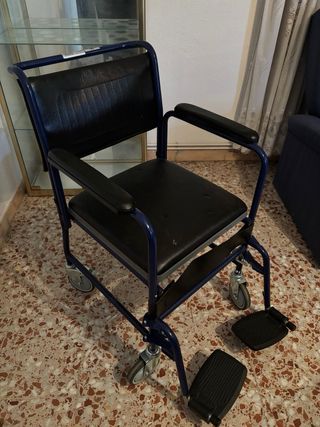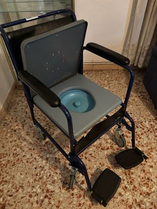 Silla con cubeta y ruedas de Mobiclinic. Asiento y reposabrazos son acolchados. Reposapies individuales. Con ruedas giratorias. Como nuevo. Solo se ha usado como silla.