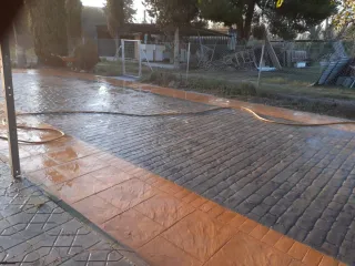 Suelo de hormigón impreso y fratasado, ideal para exteriores. Tiene un aspecto elegante y moderno. - Perfecto para piscinas o zonas ajardinadas. - Acabado de alta calidad. - Resistente y duradero.