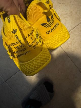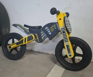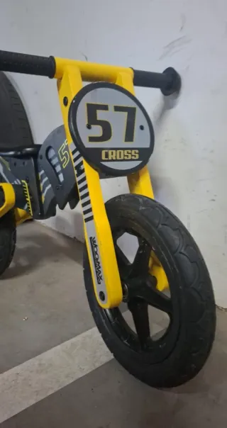 Mini moto de equilibrio con diseño de moto de cross. - Color amarillo y negro. - Número 57 en la parte frontal. - Ruedas de goma.