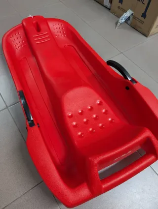 Trineo de plástico rojo, diseñado para deslizarse por la nieve. - Asiento con relieve para mayor agarre. - Asas laterales negras para sujetarse y frenar. - Diseño ergonómico para comodidad.