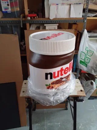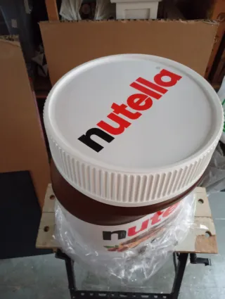 Un bote de Nutella de tamaño gigante 51cm alto, 36cm diámetro tapa, 42 ancho, perfecto para los amantes de esta crema de cacao y avellanas. Ideal como elemento decorativo o para eventos. Sirve de taburete y en su interior para guardar cosas. - Diseño icónico de Nutella. - Tapa blanca con estrías. - Etiqueta frontal con el logo y la imagen del producto.