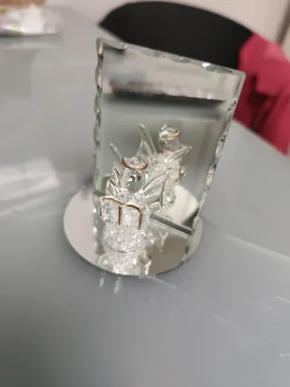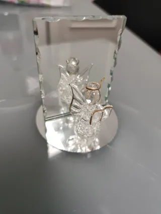 Preciosa figura decorativa de un ángel en cristal con detalles dorados, montada sobre una base de espejo. - Diseño delicado y elegante. - Base circular reflectante. - Adorno de ángel con alas y aureola.