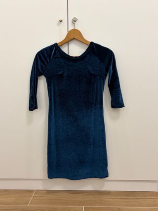 Elegante vestido de terciopelo en tono verde azulado. - Tejido de terciopelo suave. - Cremallera frontal. - Mangas tres cuartos con detalle de botones.