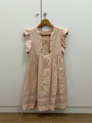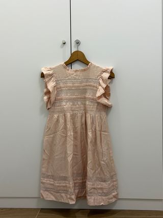 Vestido de verano en tono rosa, ideal para días cálidos. Presenta un diseño delicado con detalles. - Mangas con volantes. - Adornos de encaje en el corpiño y el bajo. - Tejido ligero y fresco.
