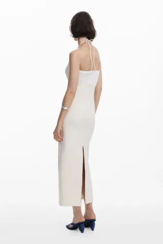 Vestido largo de Desigual con un diseño llamativo. - Escote cut-out, la parte interior en contacto con el pecho es de la misma textura que por fuera. Los tirantes cruzados proporcionan una buena sujeción. Es cómodo incluso sin sujetador. - 88% algodón. Tacto agradable. La figura es Slim, pegada la cuerpo. En la imagen se observa una talla S en una modelo de medidas: Altura: 177 cm; Cintura: 62 cm; Cadera: 90 cm. En mi caso, vendo un vestido de talla M que con mis medidas de 70 cm cintura y 95 cm cadera a mi resulta demasiado ajustado.