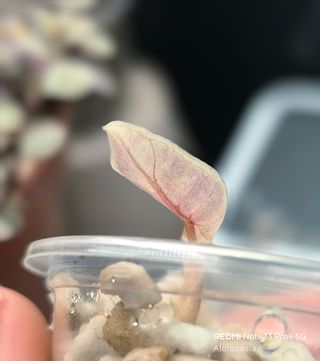 Planta Alocasia Polly Pink Albo,la primera hojita a salido muy pequeñita, la mamá es la de la segunda foto (no está en venta) - Hojas con patrón variegado. - Ideal para coleccionistas.
