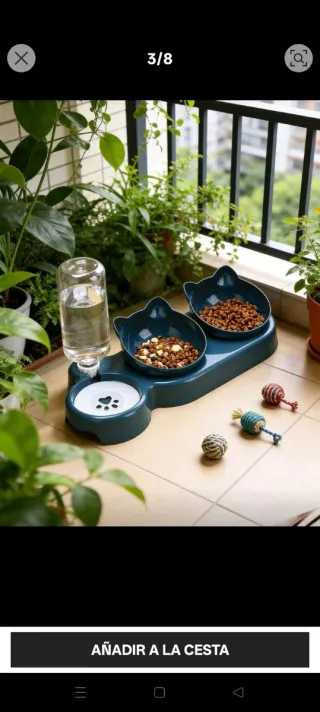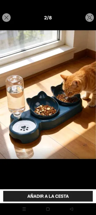 Comedero doble para mascotas con dispensador de agua. - Dos cuencos para comida. - Dispensador automático de agua. - Diseño con forma de orejas de gato.