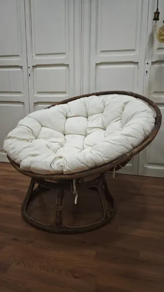 Sillón circular de ratán y tela.