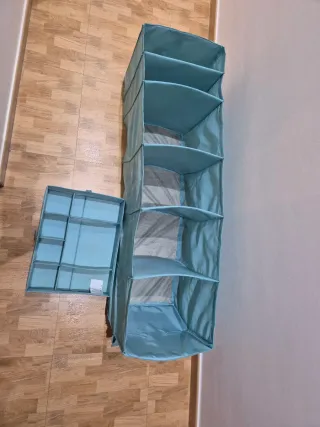 Organizador colgante de tela de Ikea. - Fácil de colgar en la barra del armario. Tengo dos de la misma medida. Uno de ellos en la parte de colgarlo está un poco descosido, se puede arreglar seguro. 5€ precio por unidad. Dos 10€.