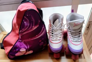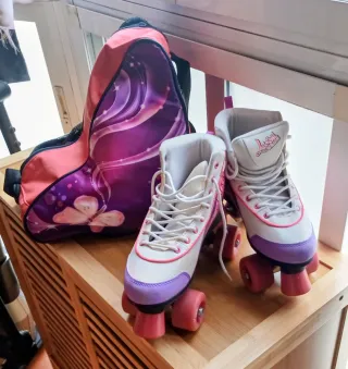 Set de patines de cuatro ruedas. - Talla 39. - Diseño blanco con detalles en rosa y morado. - Incluye mochila a juego con estampado de mariposas y remolinos.