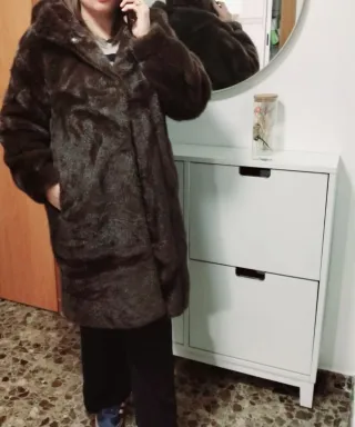 Elegante abrigo de piel sintético con capucha. - Diseño largo y confortable. - Cierre de botones. - Bolsillos laterales.