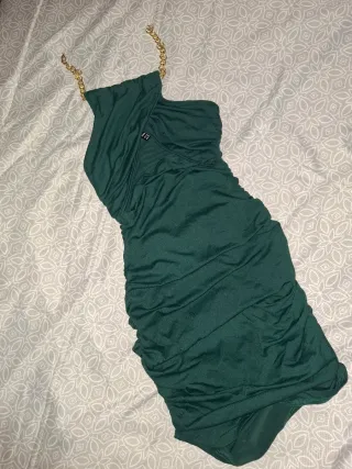 Vestido de fiesta verde con cadena dorada