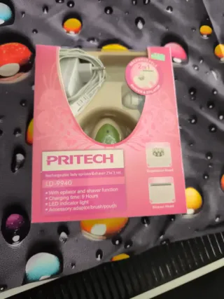 Depiladora Pritech recargable 2 en 1, modelo LD-9940. Incluye cabezal de depilación y cabezal de afeitado. - Función de depiladora y afeitadora. - Tiempo de carga: 9 horas. - Luz indicadora LED. - Accesorios incluidos: adaptador, cepillo y neceser. Me la regalaron y no la he utilizado porque tengo una Silk-epil. Nunca la he utilizado.