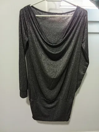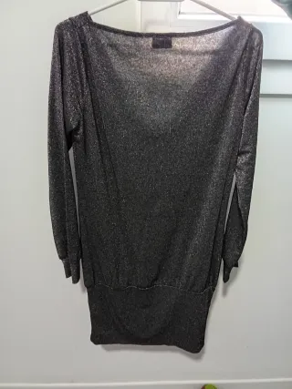 Vestido elegante con un acabado brillante que capta la luz. Su diseño drapeado en el escote le da un toque sofisticado. - Tejido con hilos plateados. - Mangas largas. - Corte holgado en el cuerpo.