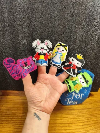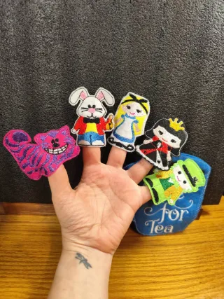 😄 Titellas/marionetas cuenta cuentos de dedo, Alicia en el país de las maravillas 🎁-Originales para regalar o para tu peque. 🧵Bordado y confeccionado en fieltro. 📦-La tazita es para guardar las titellas. 🫶-Hecho a mano. 🤓-Proximamente mas modelos en mi perfil.