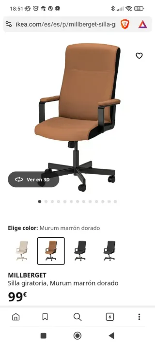 Silla de escritorio Ikea Millberget en color marrón. - Tapicería de piel sintética. - Base y estructura de metal. Nueva vale 99