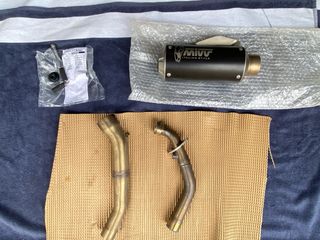 Sistema de escape completo y original Mivv MK3 para Honda CB125R del año 2021 hasta 2024, incluye todo: tornillería, adaptadores, línea completa y silenciador en acabado negro. Se ha utilizado durante 3 meses, 2.000km. Esta nuevo. El precio no es negociable.
