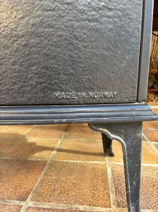 Estufa de leña de hierro fundido JOTUL con puerta de cristal. - Diseño clásico y robusto. - Puerta con ventana de cristal. - Base con patas curvas.