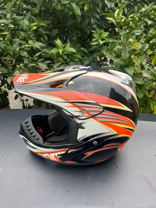 Casco de moto con diseño deportivo y vibrante. - Marca Aprilia. - Diseño multicolor con detalles en naranja, amarillo, blanco y negro. - Interior acolchado para mayor comodidad.