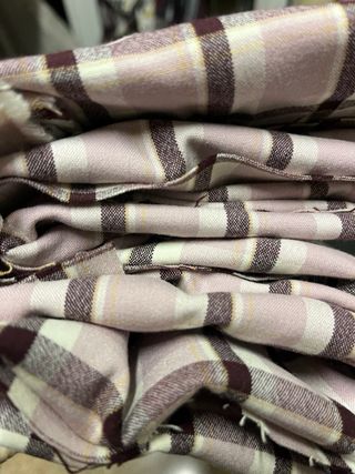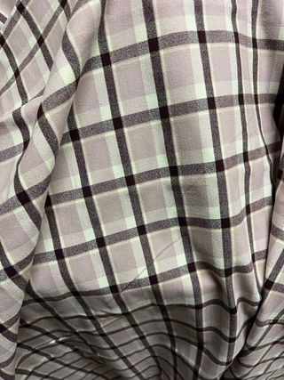 Tela de algodón con estampado de cuadros en tonos lilas, blancos y granates. Es extensible y tiene un tacto suave. - Medidas aproximadas: 150 x 210 cm. - Composición: 100% algodón.