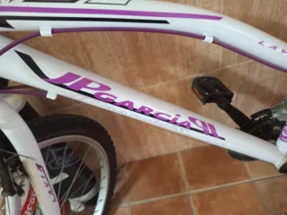 Bicicleta de montaña marca JP Garcia, modelo Cadete, en color blanco con detalles morados. - Cuadro de aluminio. - Ruedas de 24 pulgadas. - Frenos V-brake.