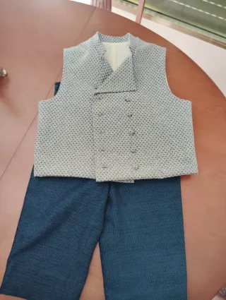 Traje de fallero de torrentí con un diseño clásico. El pantalón es la talla 36 y el chaleco talla 48 - Chaleco de doble botonadura con estampado. Medidas de largo de hombro a cintura: 44 cm. Y de cintura 96cm. El chaleco aún tiene para sacar de largo - Pantalón liso. Medidas largo: 60 cm. Cintura : 80cm. Con goma trasera.