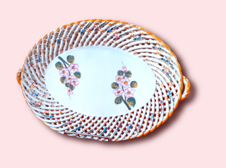 Bonita cesta artesanal de cerámica de los años 60/70, perfecta para servir y presentar el pan. Presenta un diseño calado y está pintada a mano con delicados motivos florales. - Diseño calado. - Pintura floral detallada. - Acabado artesanal. #cesta #panera #ceramica #cocina