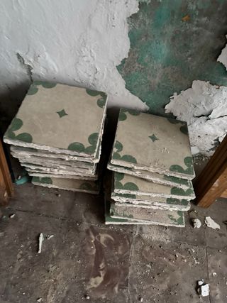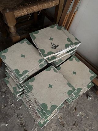 Conjunto de baldosas hidráulicas con un diseño clásico y elegante. Perfectas para dar un toque retro a cualquier espacio. - Diseño con motivos florales en verde. - Base de color beige claro. - Aprox. 15 baldosas disponibles.