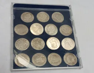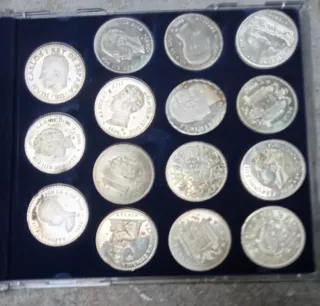Conjunto de monedas antiguas, algunas con retratos de reyes y escudos. - Monedas con inscripciones en español. - Diseños detallados en cada pieza. - Ideal para coleccionistas.