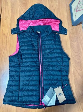 Chaleco acolchado Trespass tallaje mujer. - Tiena la etiqueta porque está por estrenar. El precio era de 46 euros. - Exterior negro con forro interior rosa. - La capucha se puede quitar. - Cierre de cremallera frontal.