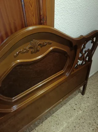 Cabecero de madera con un diseño elegante y detallado. Ideal para camas de 135 cm. - Acabado en tono marrón cálido. - Detalles ornamentales tallados.