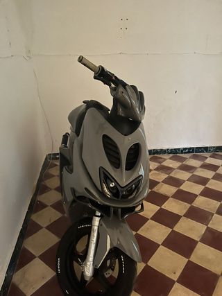 Scooter Yamaha Aerox en color gris. Un vehículo ágil y deportivo. - Diseño moderno y aerodinámico. - Manillar con puños de alta calidad. - Ruedas con llantas negras y neumáticos Innova y Metzeler -Color Gris Nardo