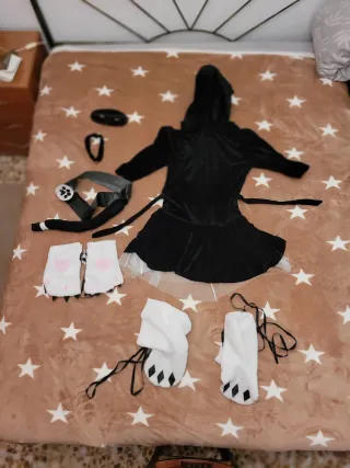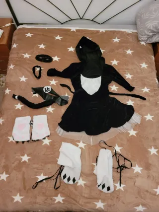 Conjunto de disfraz de gatita con varios accesorios. - Vestido negro con capucha y detalles blancos. - Orejas de gato integradas en la capucha. - Cola negra. - Gargantilla con cascabel. - Antifaz negro. - Guantes blancos con almohadillas rosas. - Cubrezapatos blancos con diseño de huellas.